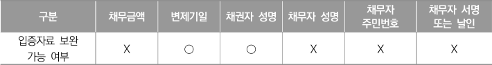 ※ 이는 주민등록법 시행규칙 [별표]에서 인정하는 서류가 “채권자와 채무자의 서명 또는 날인이 되어 있고 변제기일이 적혀 있는 계약서 등”이라고 규정하고 있으므로, 채무자의 인적사항 및 서명 또는 날인과 채무금액 등은 필수로 요구하고 있는 항목이므로 내용증명으로 보완이 불가능함![]() ※ 다만, 채권자의 성명은 입증자료 원본을 소지한 사람을 채권자로 보아 내용증명으로 보완 허용 ※ 「민법」 제387조에 따라 채무이행의 기한이 없는 경우에는 채무자는 이행청구를 받은 때로부터 지체 책임이 있으므로, 차용증 등에 변제기일이 없는 경우에는 내용증명으로 보완 가능 |