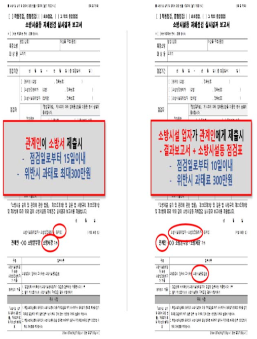 | 질의 | 「소방시설법」 제22조제1항에 따라 관리업자가 10일 이내 관계인에게 보고서 및 점검표를 제출하여야 하고 어길시 과태료 규정이 신설됐는데, 10일 이내에 관계인에게 제출했다는 증빙자료는? 이와 관련하여 변경된 서식을 [붙임]과 같이 해석 및 적용하고 업자가 관계인에게 준 보고서의 날짜를 기준으로 적발의 증빙자료로 삼아야 하는 것인지? |