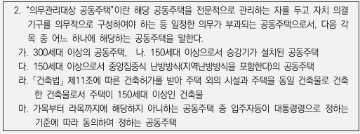 | 회시 | 1) 「화재예방법 시행령」 별표 4 제3호가목4)에서 2급 소방안전관리대상물은 옥내소화전 설비 또는 스프링클러설비가 설치된 공동주택에 한정한다고 규정하고 있음. 따라서 기존 아파트가 「공동주택관리법」 제2조제1항제2호의 어느 하나의 아파트에 해당이 되고 옥내소화전 또는 스프링클러설비가 설치된 대상은 2급 소방안전관리대상물이며 자체점검도 실시하여야 함.![]() 2) 또한, 연립 및 다세대 주택의 주차장이 「소방시설법 시행령」 별표 2 제18호자목의 자동차 관련 시설에 해당되어 물분무등소화설비를 설치한 경우에도 2급 소방안전관리자 선임대상이며, 자체점검을 실시해야 함. |