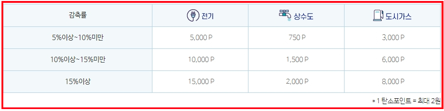 가정 내 사용하는 에너지 항목(전기, 상수도, 도시가스)을 과거 1~2년간 월별 평균 사용량과 현재 사용량을 비교하여 절감비율에 따라 탄소포인트를 부여가 됩니다.
