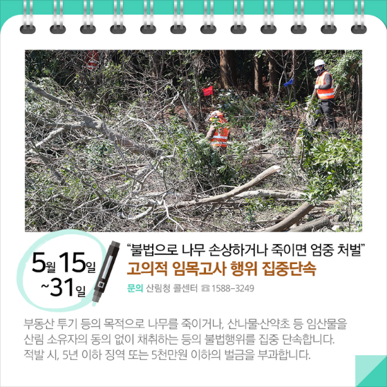 ◆ “불법으로 나무 손상하거나 죽이면 엄중 처벌”…고의적 임목고사 행위 집중단속(5.15.~31.)