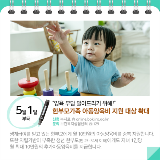 ◆ “양육 부담 덜어드리기 위해!”… 한부모가족 아동양육비 지원 대상 확대(5.1.~)