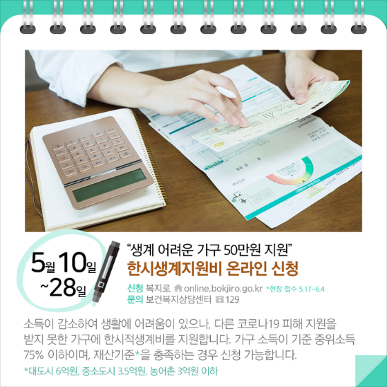 ◆ “생계 어려운 가구 50만원 지원”…한시생계지원비 온라인 신청(5.10~28.)