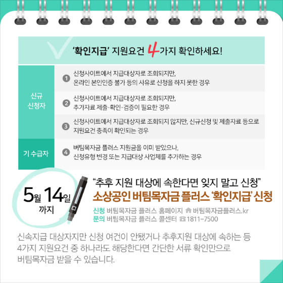 ◆ “추후 지원 대상에 속한다면 잊지 말고 신청”…소상공인 버팀목자금 플러스 ‘확인지급’ 신청(~5.14.)