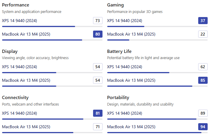 • 배터리 사용 시간은 더욱 극적인 차이를 보입니다. XPS 14가 29%나 더 큰 배터리를 탑재했음에도 불구하고, 실제 배터리 수명 점수는 M4 칩의 경이로운 전력 효율 덕분에 맥북 에어가 훨씬 높습니다. 충전기 없이 하루를 보내는 것은 맥북 에어에게는 당연한 일이지만, XPS 14에게는 도전이 될 수 있습니다.