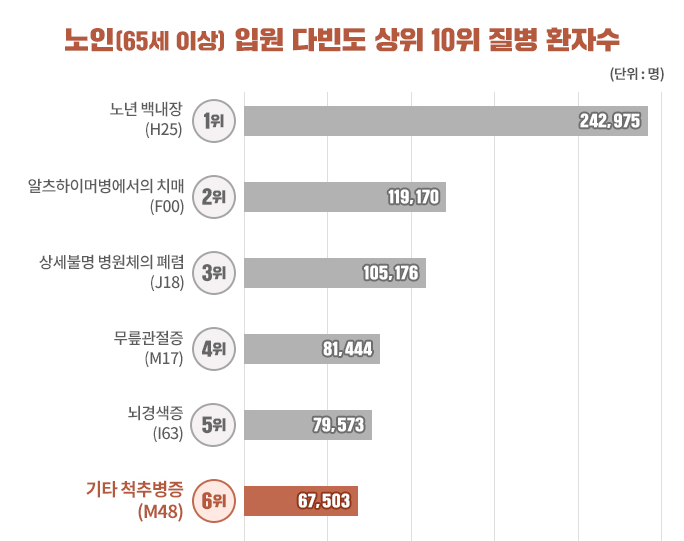 그 중에서 오늘은 65세 이상 노인분들 중 많이 입원했던 질병 중 여섯번째인 '기타 척추병증'에 대해서 살펴보고자 합니다.