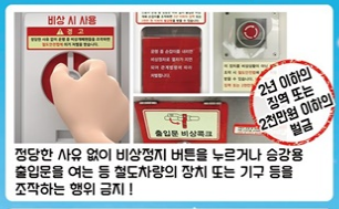 ◆ 정당한 사유 없이 비상정지 버튼을 누르거나 승강용 출입문을 여는 등 철도차량의 장치 또는 기구 등을 조작하는 행위 금지!